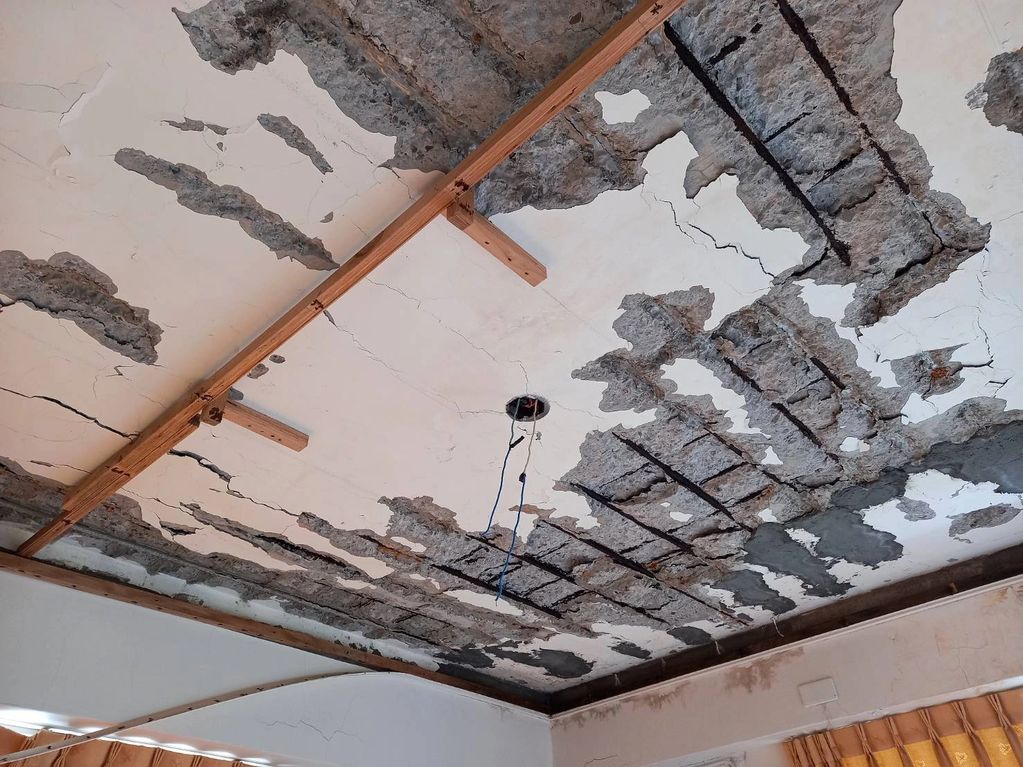 案件說明:因過去屋頂露臺積水,濕氣伴隨滲水侵入結構體,原木作天花承受不住混凝土塊沉壓,導致發生崩塌現象,幸無人受傷。除修補受損之樓板,亦使用碳纖維貼附增強耐用性。