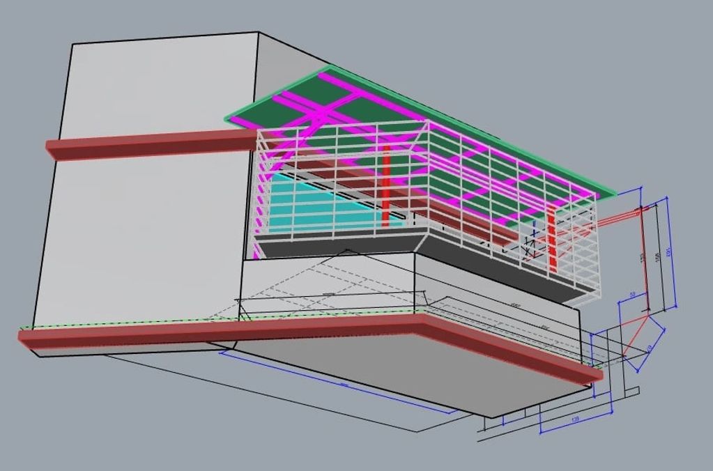 既有金屬雨遮設計不良,導致介面處滲水影響室內,現場勘驗丈量後將現況繪圖至模型,重新建置骨架及遮蔽範圍,並增加介面處順水搭接與切水版,在不干涉現況使用上規劃全新不銹鋼金屬雨遮。
